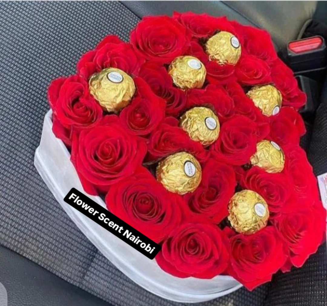Red roses box with Ferrero rocher chocolates.