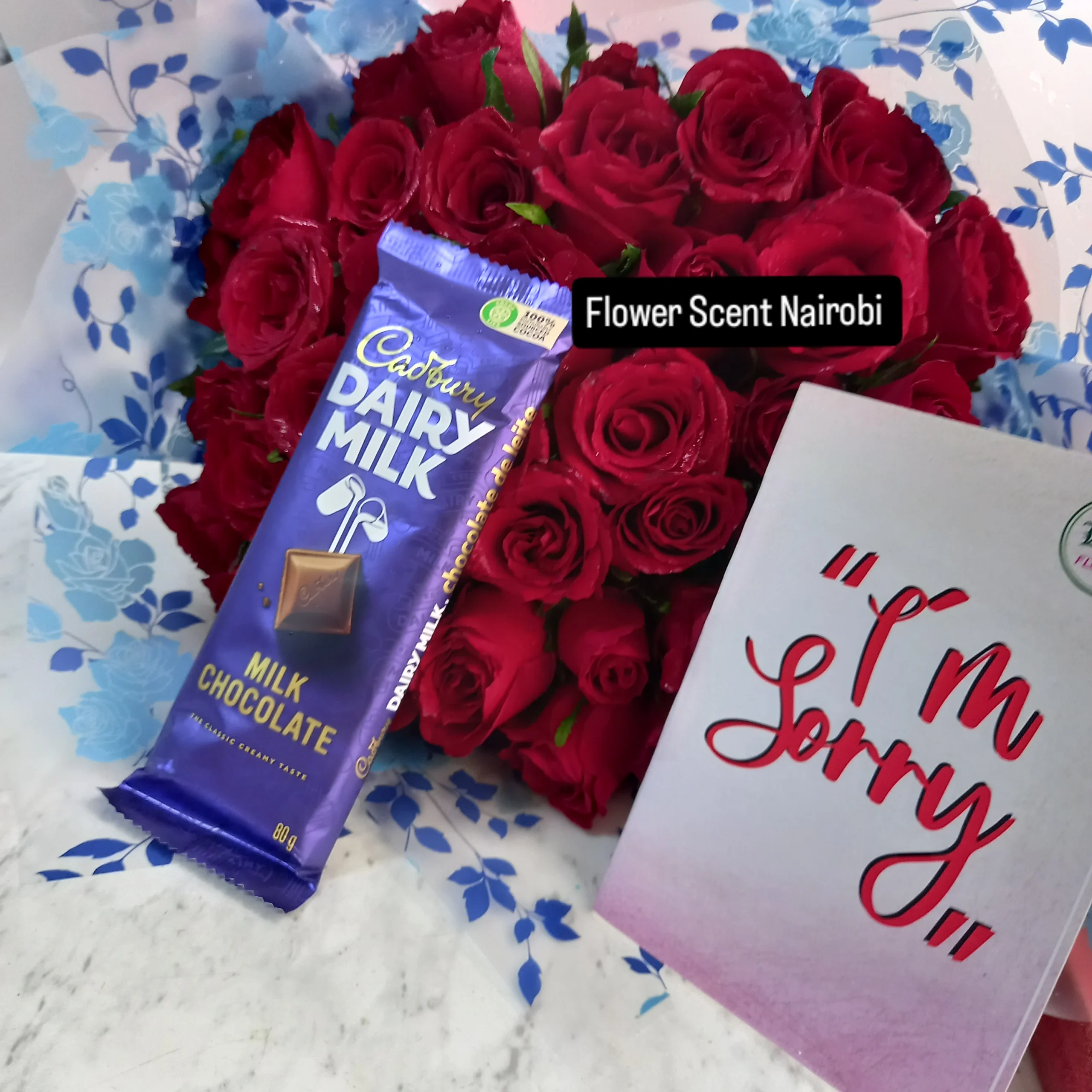 Red roses bouquet with chocolate and an apology card.